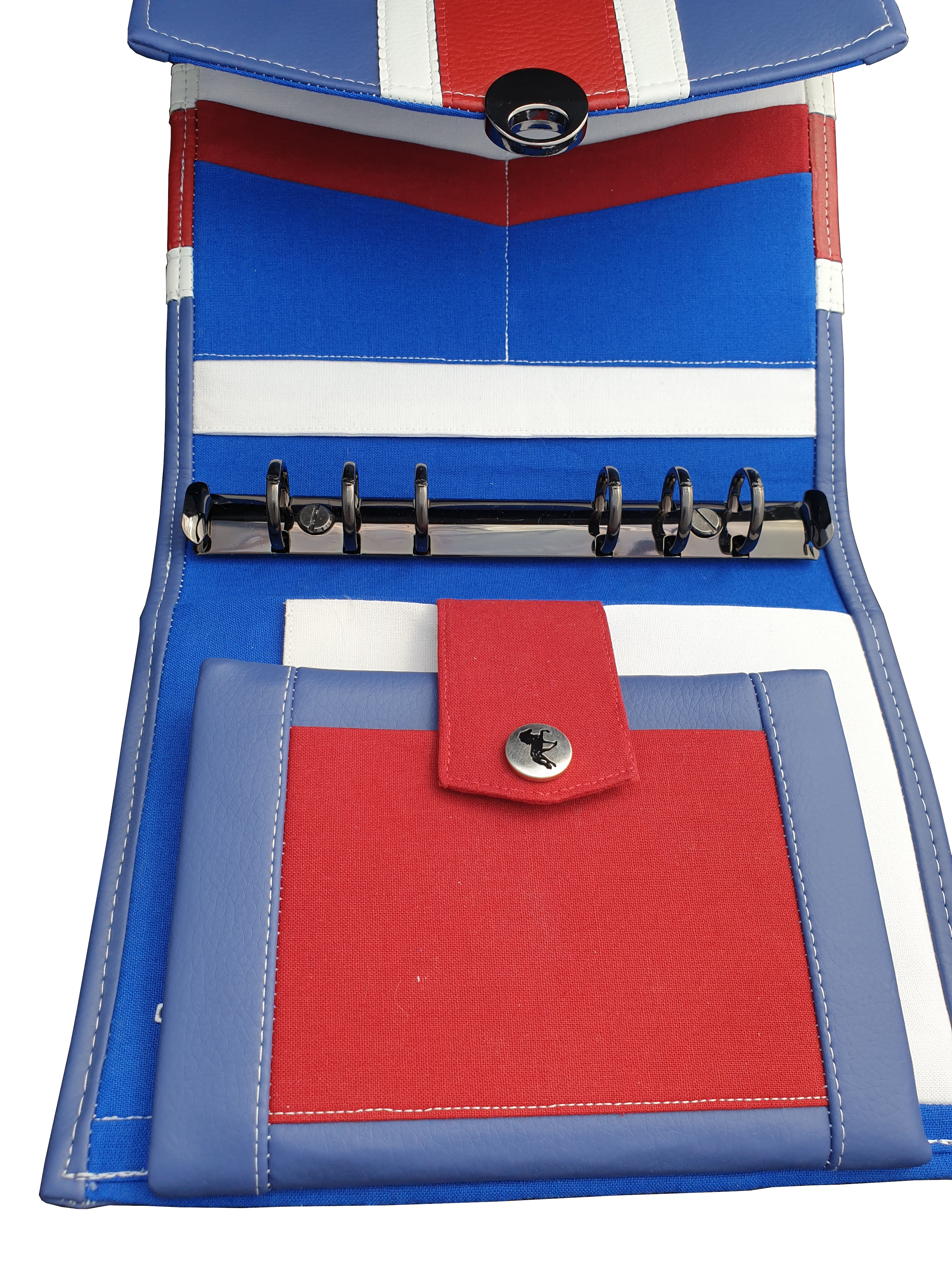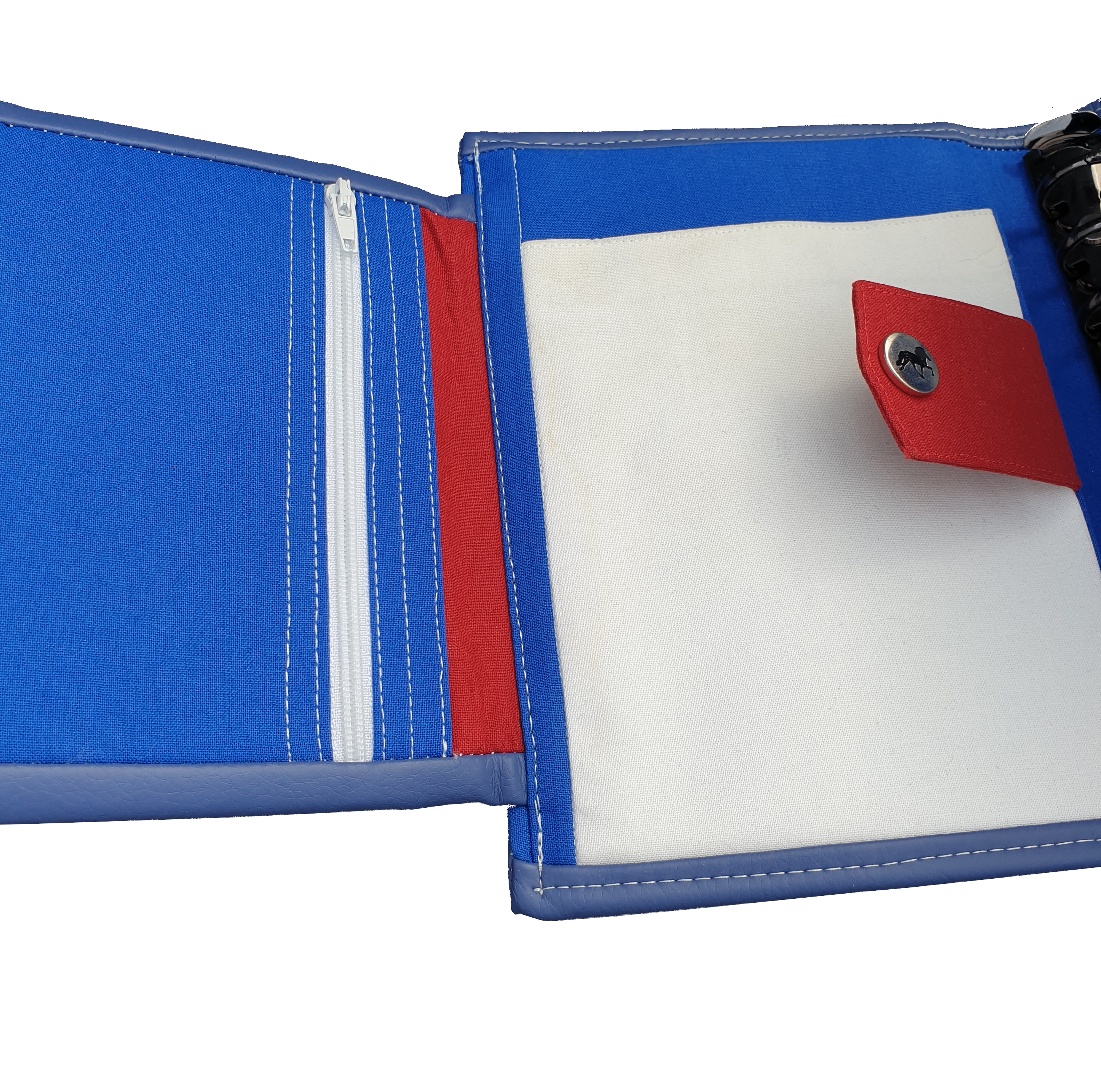 Er enthält 4 Steckplätze für (Visiten-)Karten, zwei große und zwei kleine Einsteckfächer, ein Reißverschlussfach.